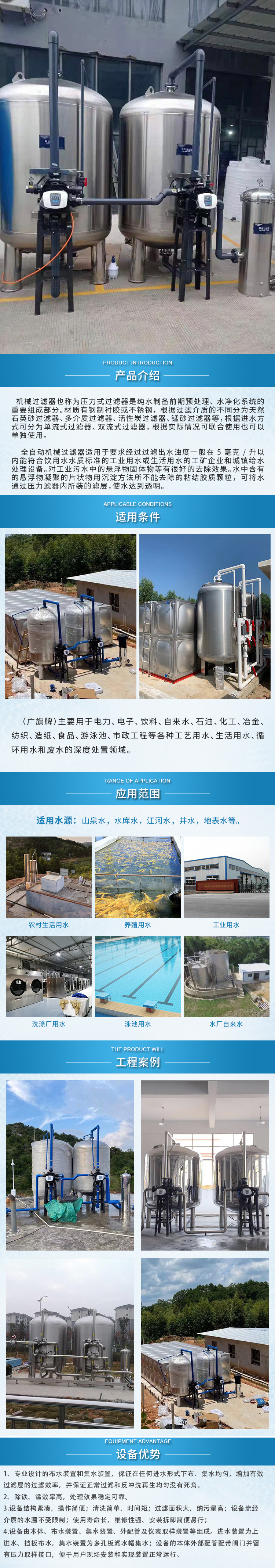 機械過濾器也稱為壓力式過濾器是純水制備前期預(yù)處理、水凈化系統(tǒng)的重要組成部分。材質(zhì)有鋼制襯膠或不銹鋼,根據(jù)過濾介質(zhì)的不同分為天然石英砂過濾器、多介質(zhì)過濾器、活性炭過濾器、錳砂過濾器等,根據(jù)進水方式可分為單流式過濾器、雙流式過濾器,根據(jù)實際情況可聯(lián)合使用也可以單獨使用。