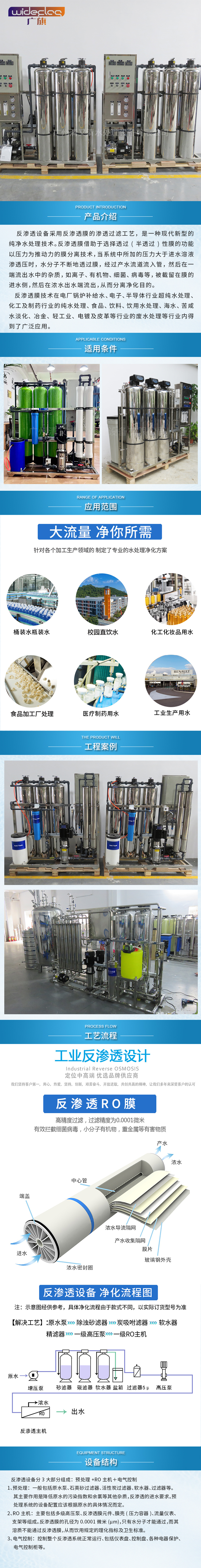 反滲透設(shè)備采用反滲透膜的滲透過濾工藝,是一種現(xiàn)代新型的純凈水處理技術(shù)。反滲透膜借助于選擇透過(半透過)性膜的功能以壓力為推動力的膜分離技術(shù),當系統(tǒng)中所加的壓力大于進水溶液滲透壓時,水分子不斷地透過膜,經(jīng)過產(chǎn)水流道流入管,然后在一端流出水中的雜質(zhì),如離子、有機物、細菌、病毒等,被截留在膜的進水側(cè),然后在濃水出水端流出,從而分離凈化目的。
